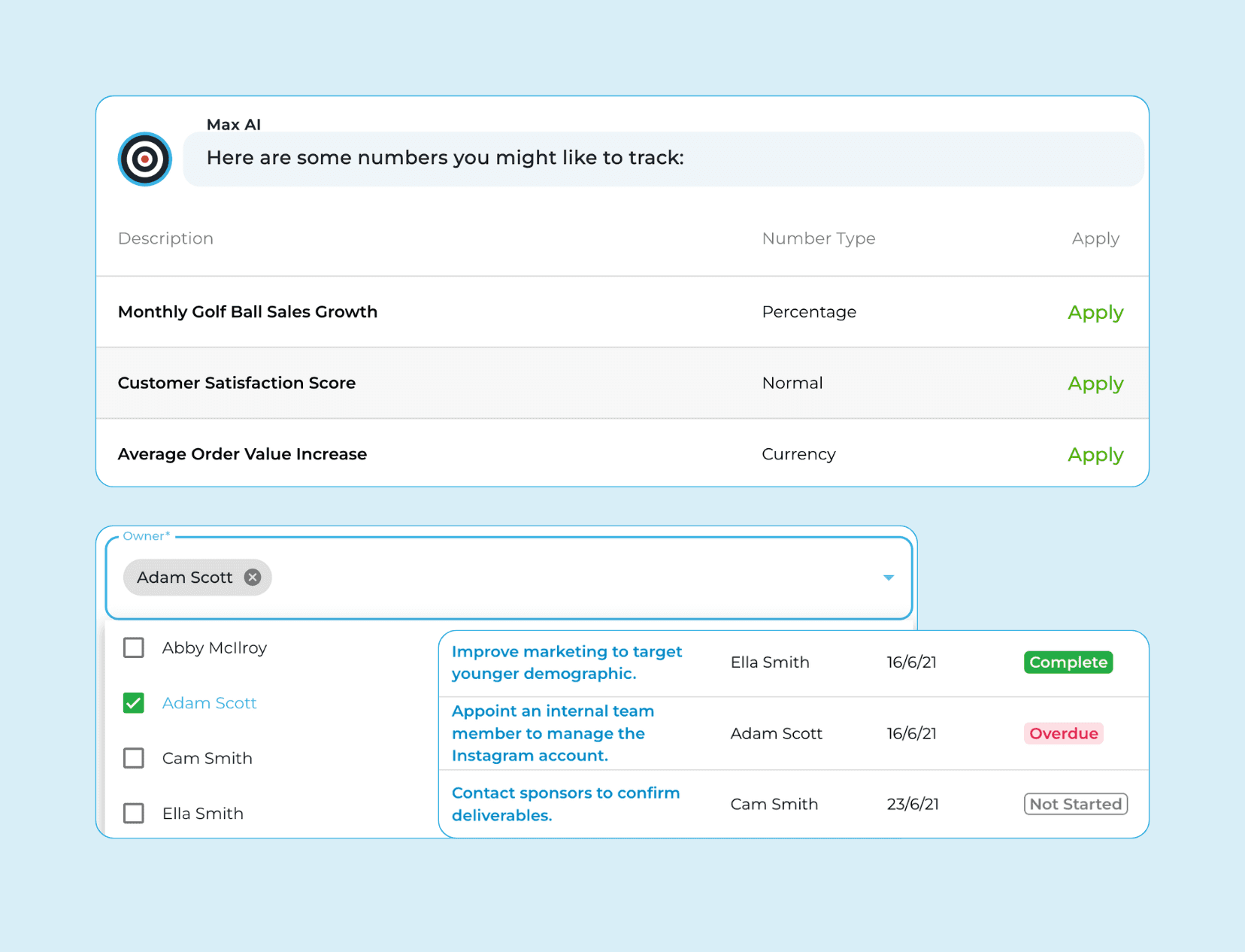 Let Max AI help you define success and create & delegate the right targets in the right format for your team with clear accountbility using best practise planning principles.